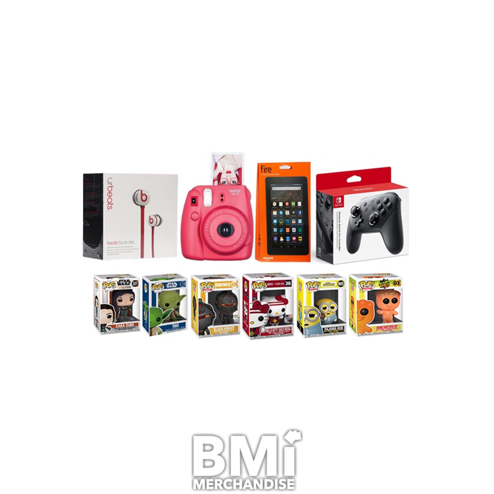 THIS KIT INCLUDES 12 LICENSED POP VINYLS, AND 14 PIECES OF ASSORTED ELECTRONICS/TECH ITEMS - SUCH AS G-SHOCK WATCHES, I PHONES, GO-PRO CAMERA, LATEST IN EARBUDS AND HEADPHONES. MERCHANDISE WILL VARY PENDING ON TRENDS!
