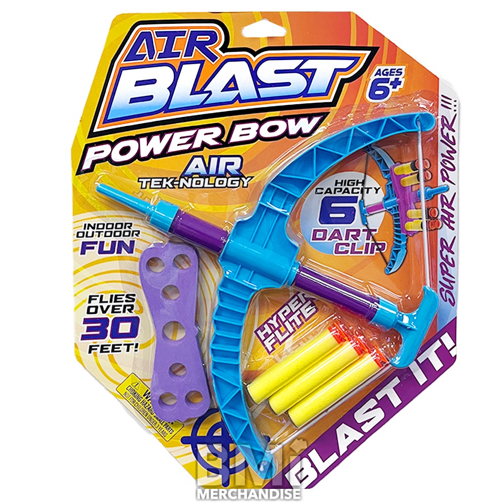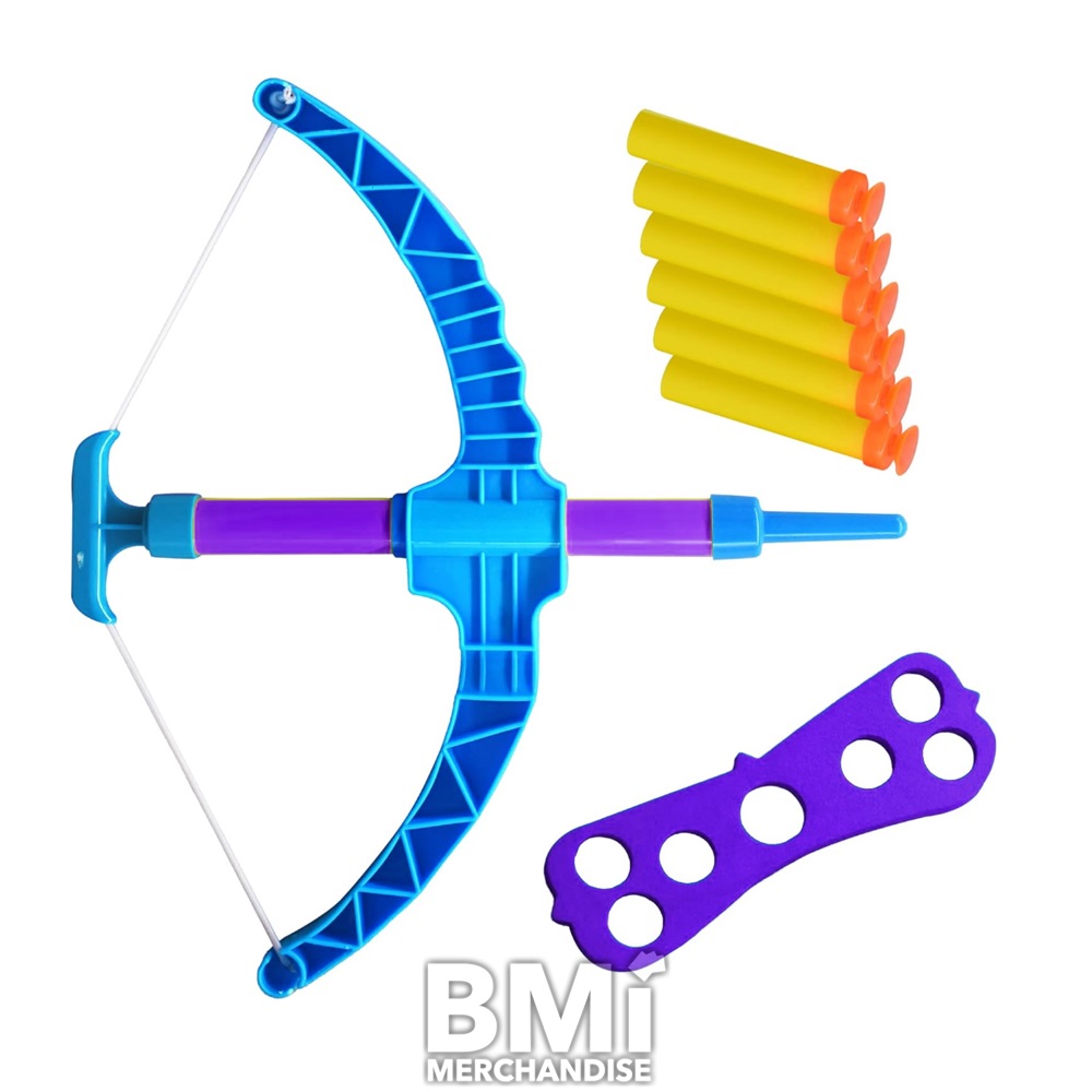 FOAM DART BOW SET. PULL BACK AND WATCH FOAM DART FLY THROUGH THE AIR! INCLUDES DART HOLDER, 6 FOAM DARTS, SHOOTS 20 FEET. PULL BACK ACTION.