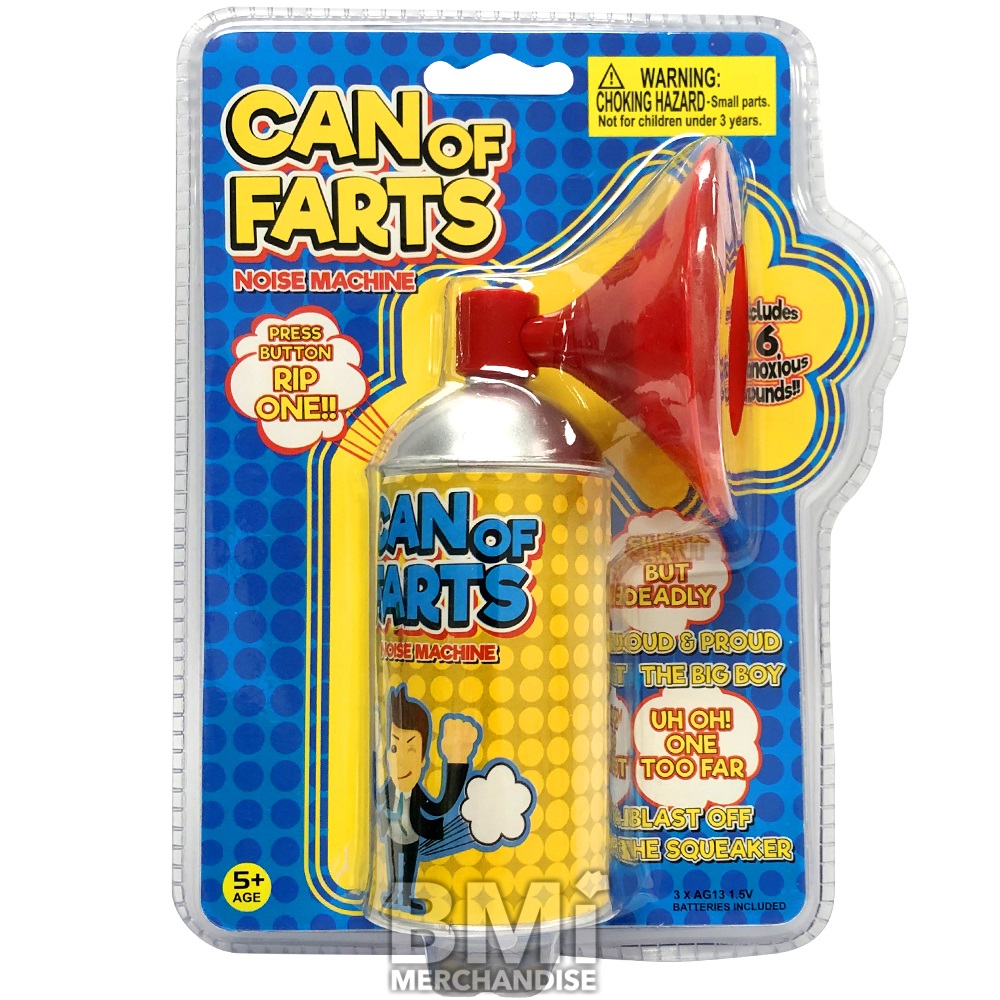 FART CAN. PRESS THE BUTTON AND A FART SOUND COMES OUT! INCLUDES 6 DIFFERENT, HYSTERICAL, OBNOXIOUS SOUNDS TO MAKE YOUR DAY.