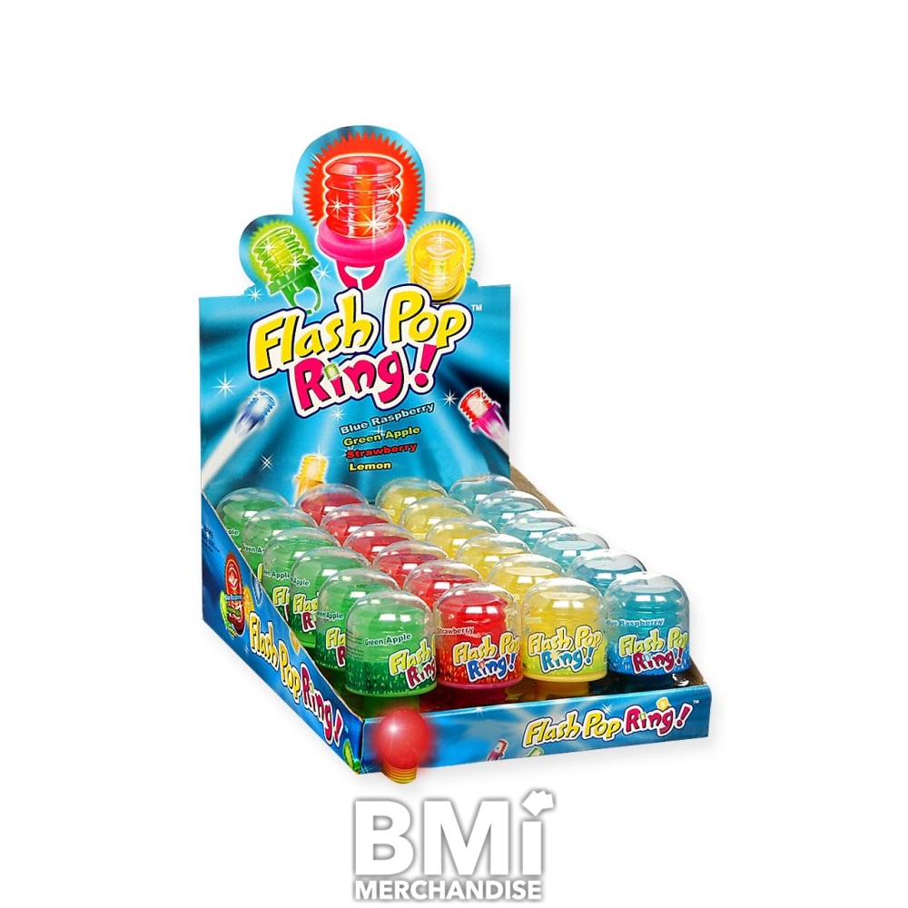 FLASH POP RING. SUPER TASTY AND SUPER FUN, THE LED LIGHT UP FLASH POP RING COMES IN ASSORTED FLAVORS AND COLORS. EACH RING WRAPPED IN A 24PC DISPLAY BOX.