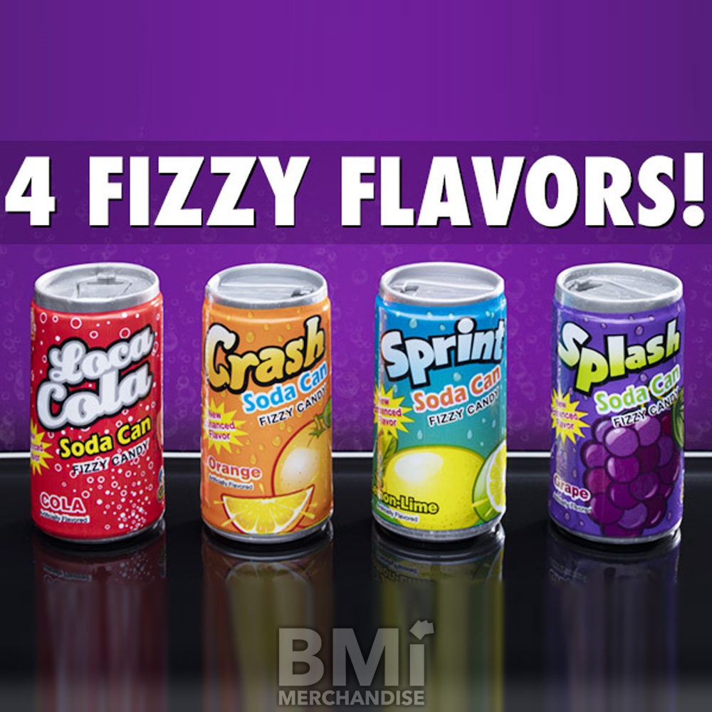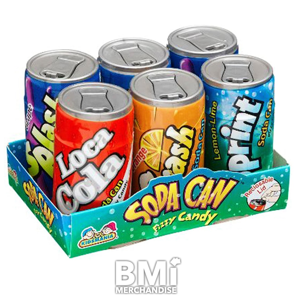 THESE TASTY LITTLE HARD CANDIES IN LITTLE SODA SHAPED CANS COME IN A SIX-PACK OF ASSORTED SODA FLAVORS. THESE CANDIES ARE FUN, COLORFUL, AND DELICIOUS. EACH "CAN" MEASURES 2" X 1" X 1". 72 CANS PER DISPLAY BOX.