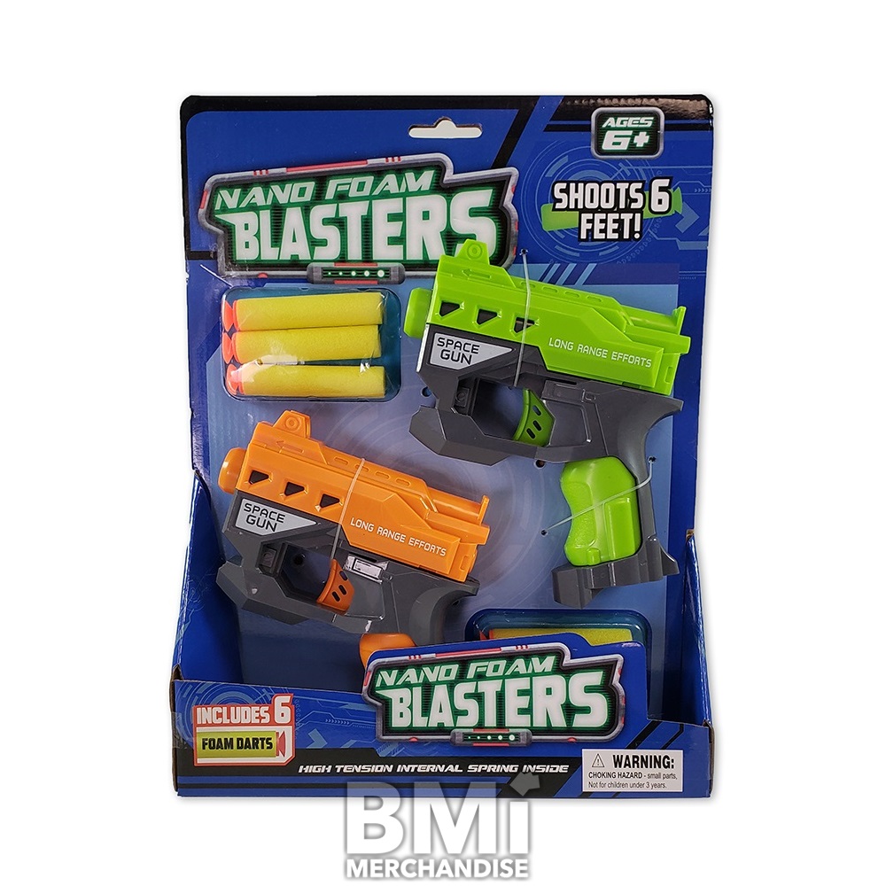 NANO FOAM BLASTERS 2PK. SAFE, LONG-RANGE FIRING FUN! SHOOTS UP TO 6 FEET. INCLUDES 2 BLASTERS AND 6 FOAM DARTS. CAN BE PEGGED OR STAND ON A SHELF.